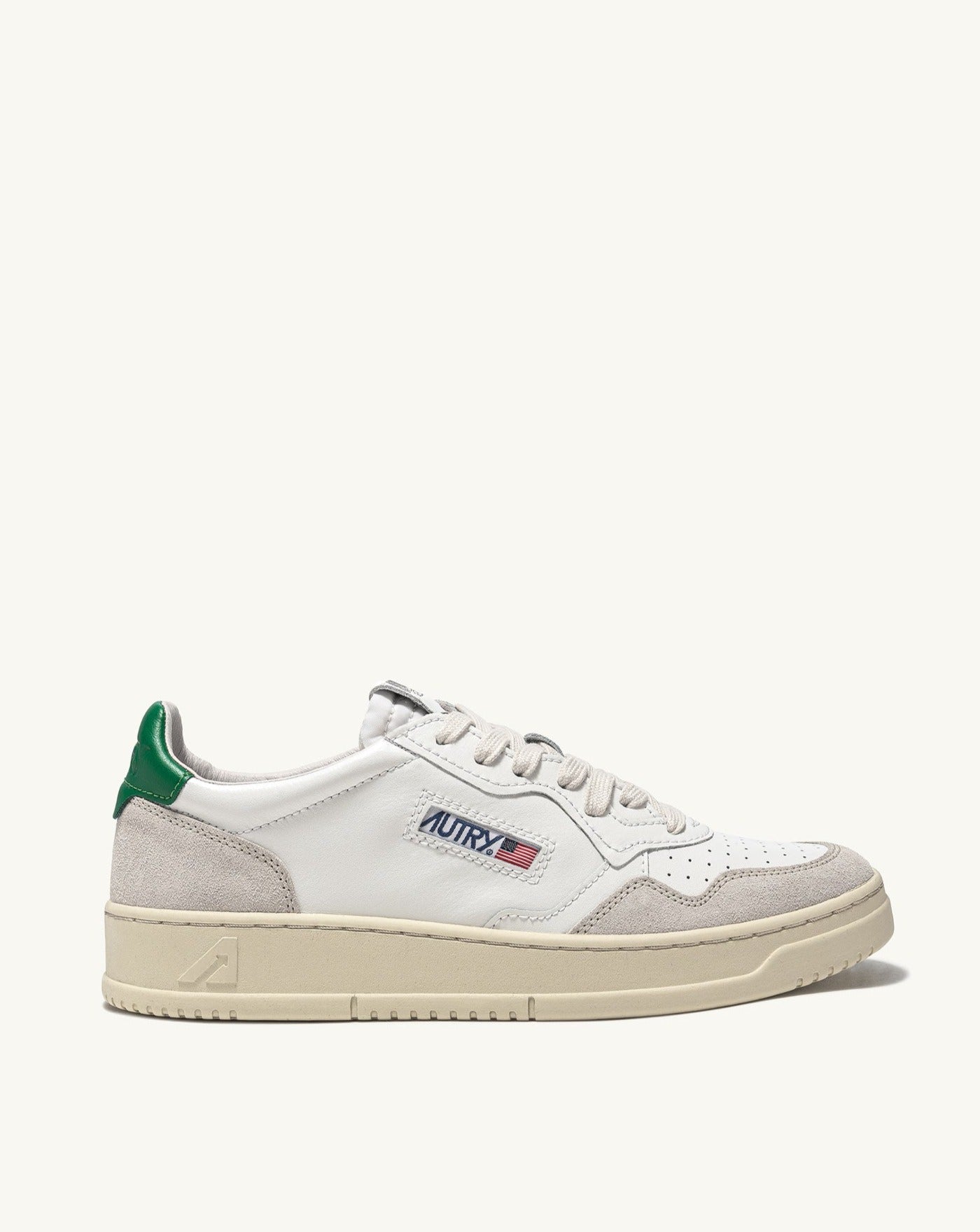 Sneaker bassa in stile vintage anni '80. Tomaia in pelle e inserti in camoscio. Punta perforata. Lacci piatti in cotone. Linguetta in nylon con etichetta logata in pelle, inserto in tessuto a contrasto con ricamo logo sul lato esterno. Collarino alla caviglia imbottito. Talloncino posteriore con inserto in ecopelle a contrasto. Logo in rilievo sul retro. Fodera in spugna di cotone. Sottopiede in pelle con logo. Suola in gomma cucita. Altezza suola punta: 2,5 cm Altezza tacco: 3,5 cm. Sistema taglie italiane. Custodia inclusa.