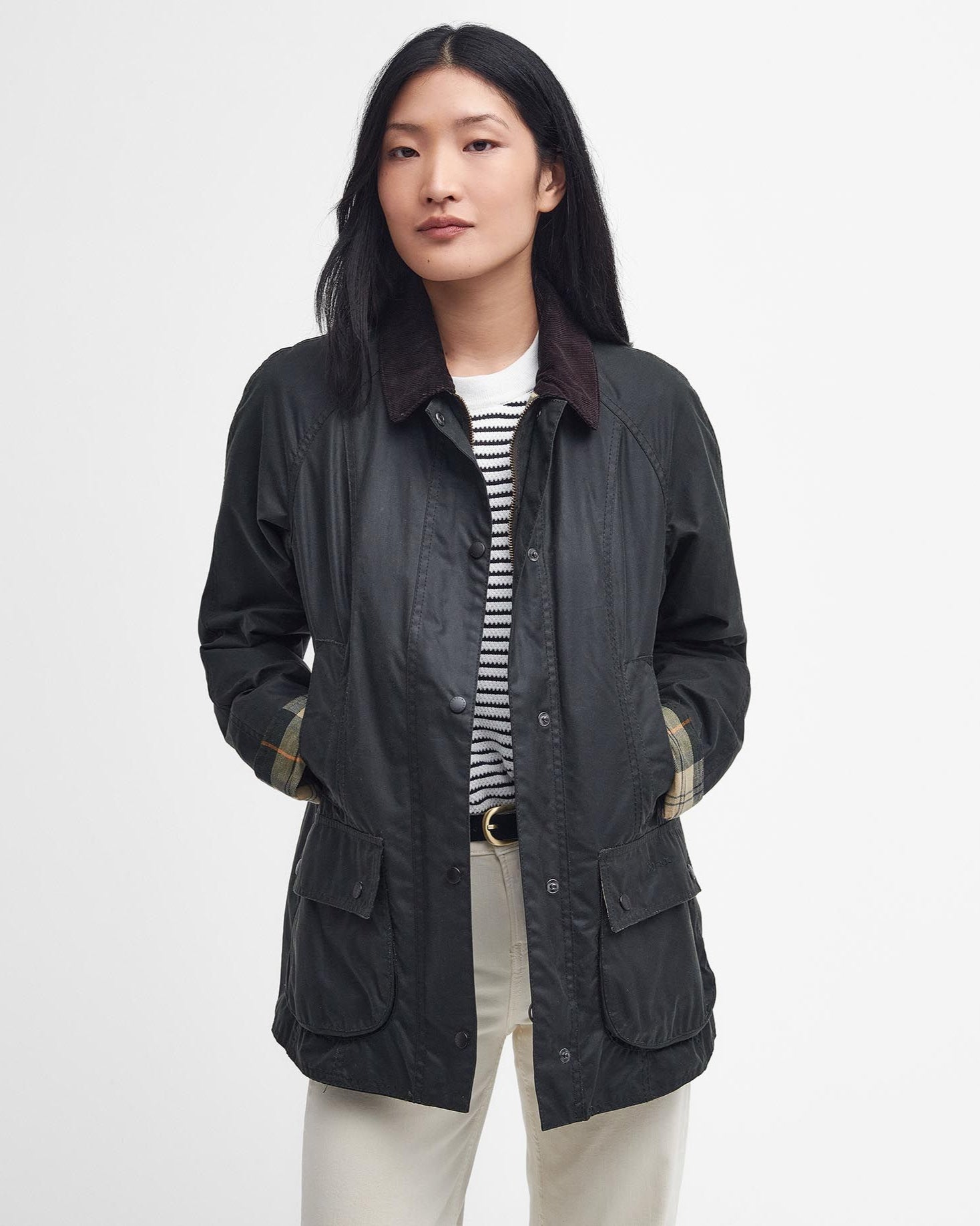 Basata sul leggendario Bedale ma tagliata su una silhouette femminile, la giacca cerata Barbour Beadnell è dotata di uno stile iconico realizzato con il tradizionale cotone cerato Thornproof. Il colletto in velluto a coste, la classica fodera in tartan e le numerose tasche per riporre tutto il necessario sono disponibili in diverse varianti, tra cui la versione con cerniera e cappuccio, che rendono la Beadnell una giacca versatile per tutte le stagioni.