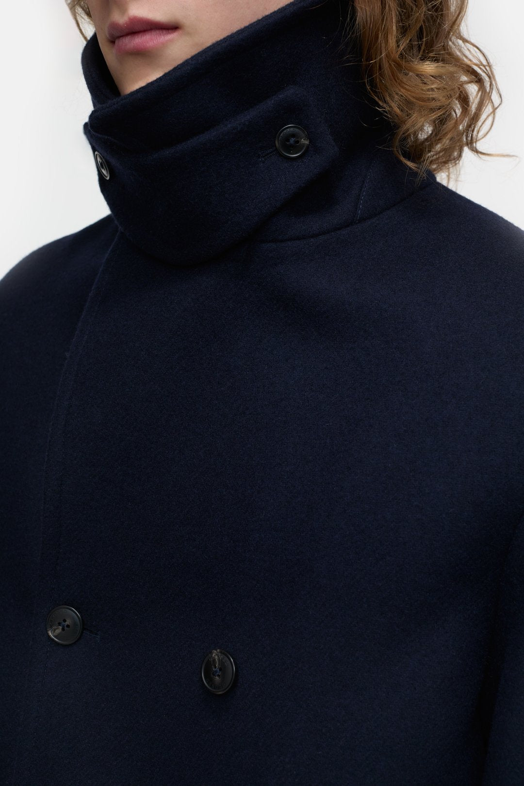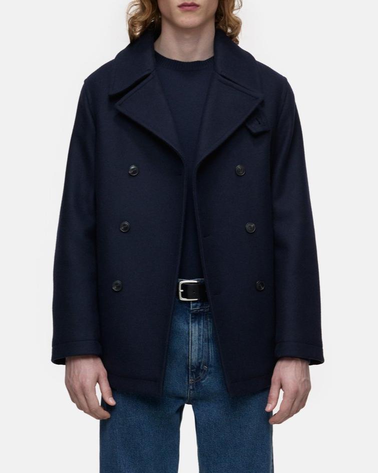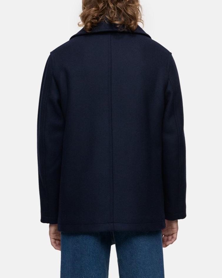 Questa giacca caban dal look pulito è realizzata in misto lana compatta di qualità italiana. Il materiale blu scuro utilizzato è composto da lana riciclata e poliammide riciclata. La giacca classica ha una vestibilità dritta con bottoni doppiopetto in corno, un ampio collo a revers e tasche oblique a fessura. La fodera è imbottita e trapuntata e presenta una tasca interna con bottone.- Vestibilità regolare