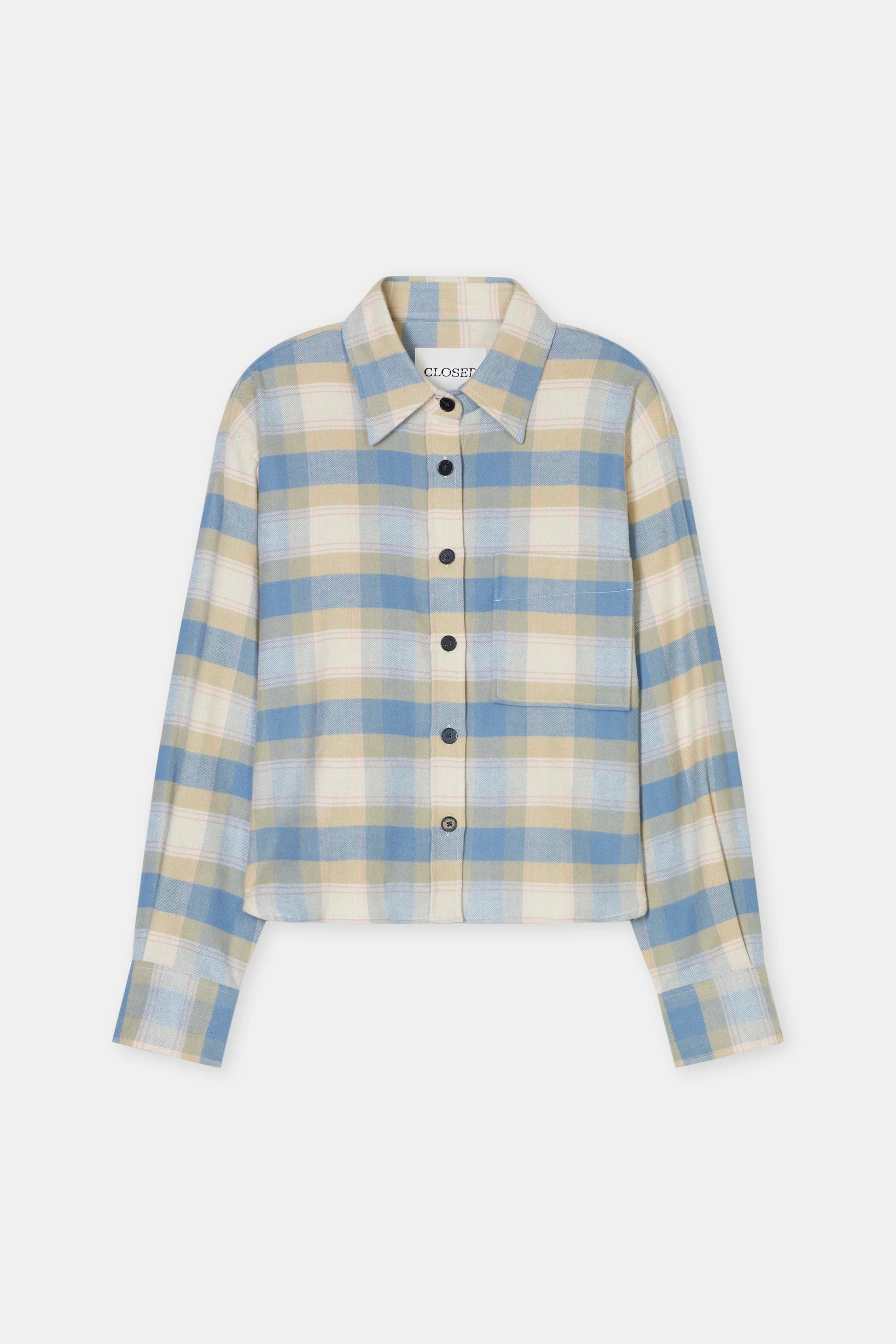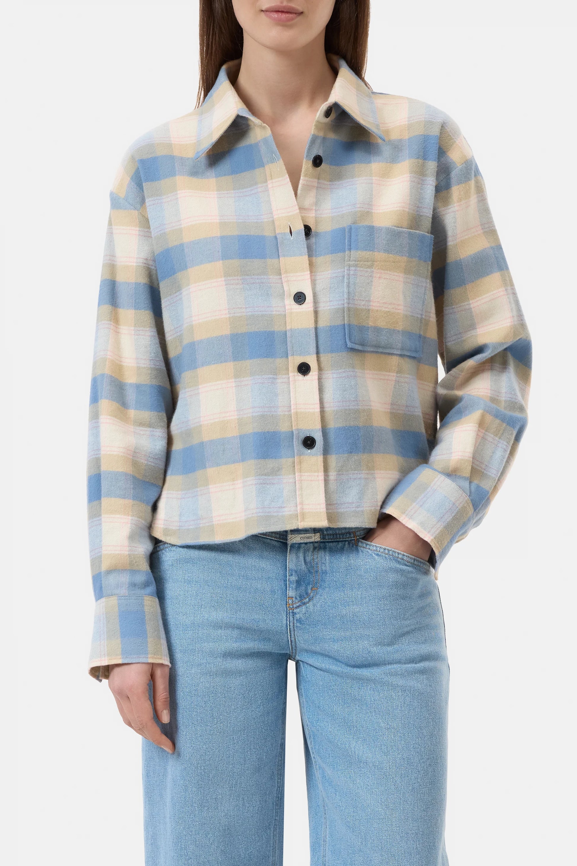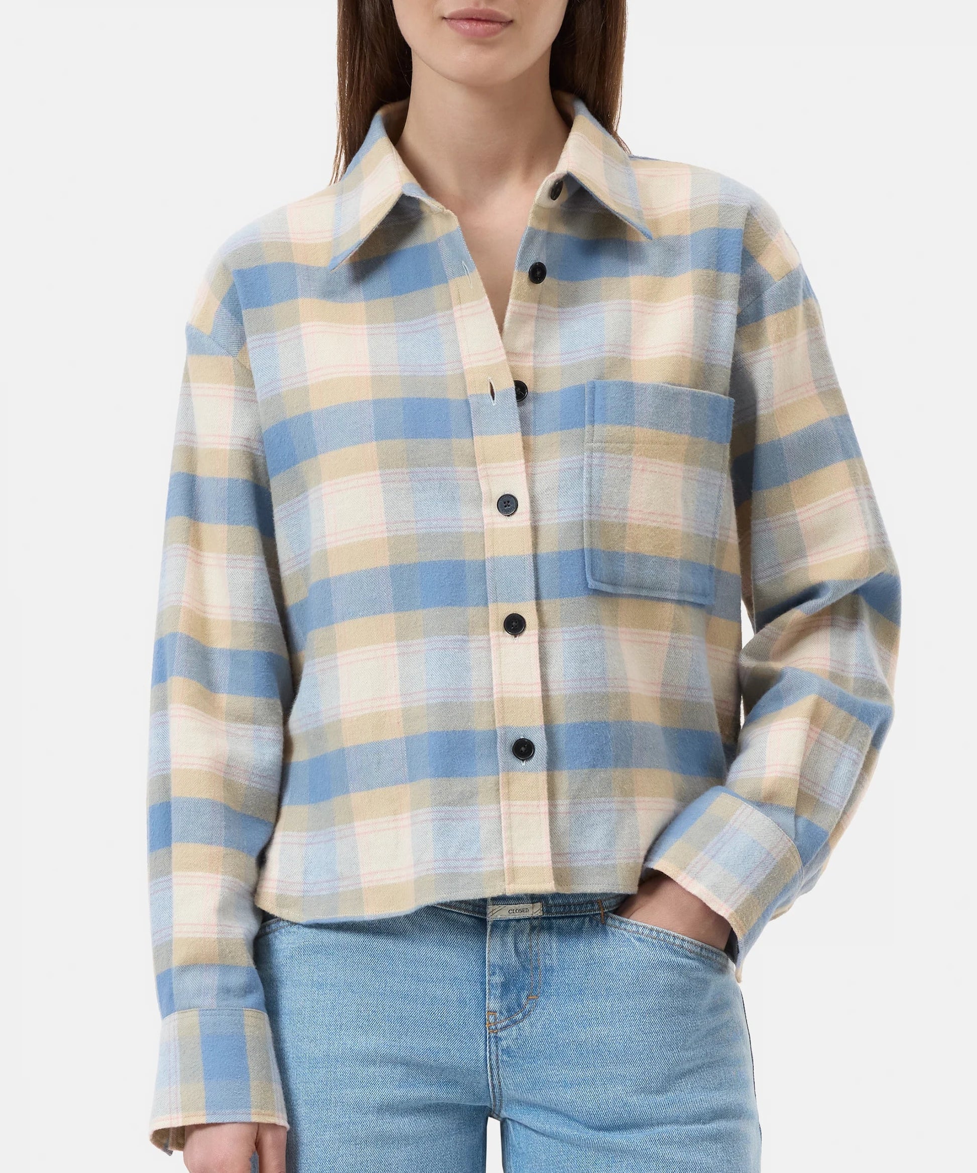 La nostra blusa oversize corta è realizzata in morbido cotone spazzolato. Presenta una tasca applicata sul petto, cuciture distintive e polsini con angoli chiusi. L'orlo arrotondato completa il look. Prodotto in Portogallo.