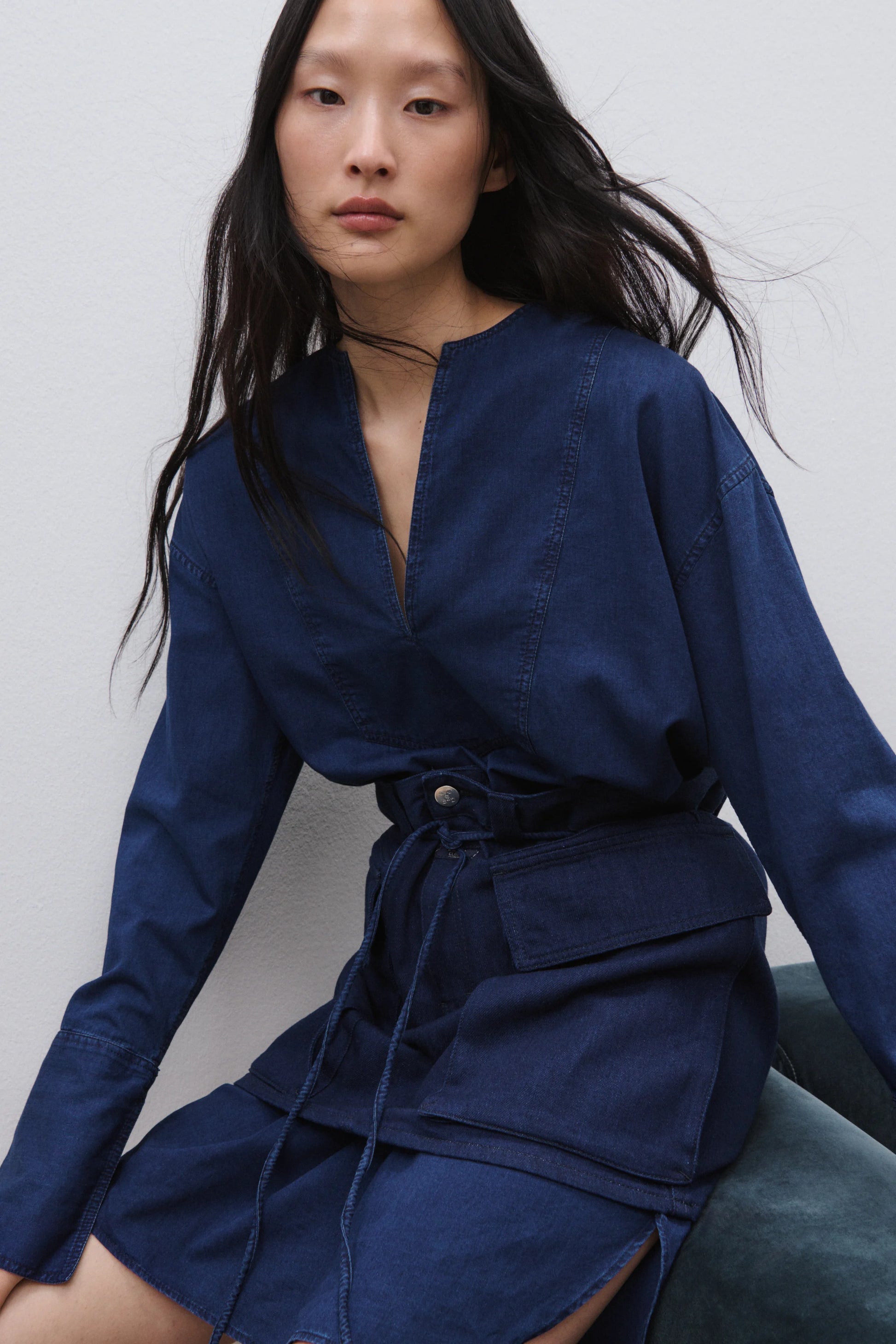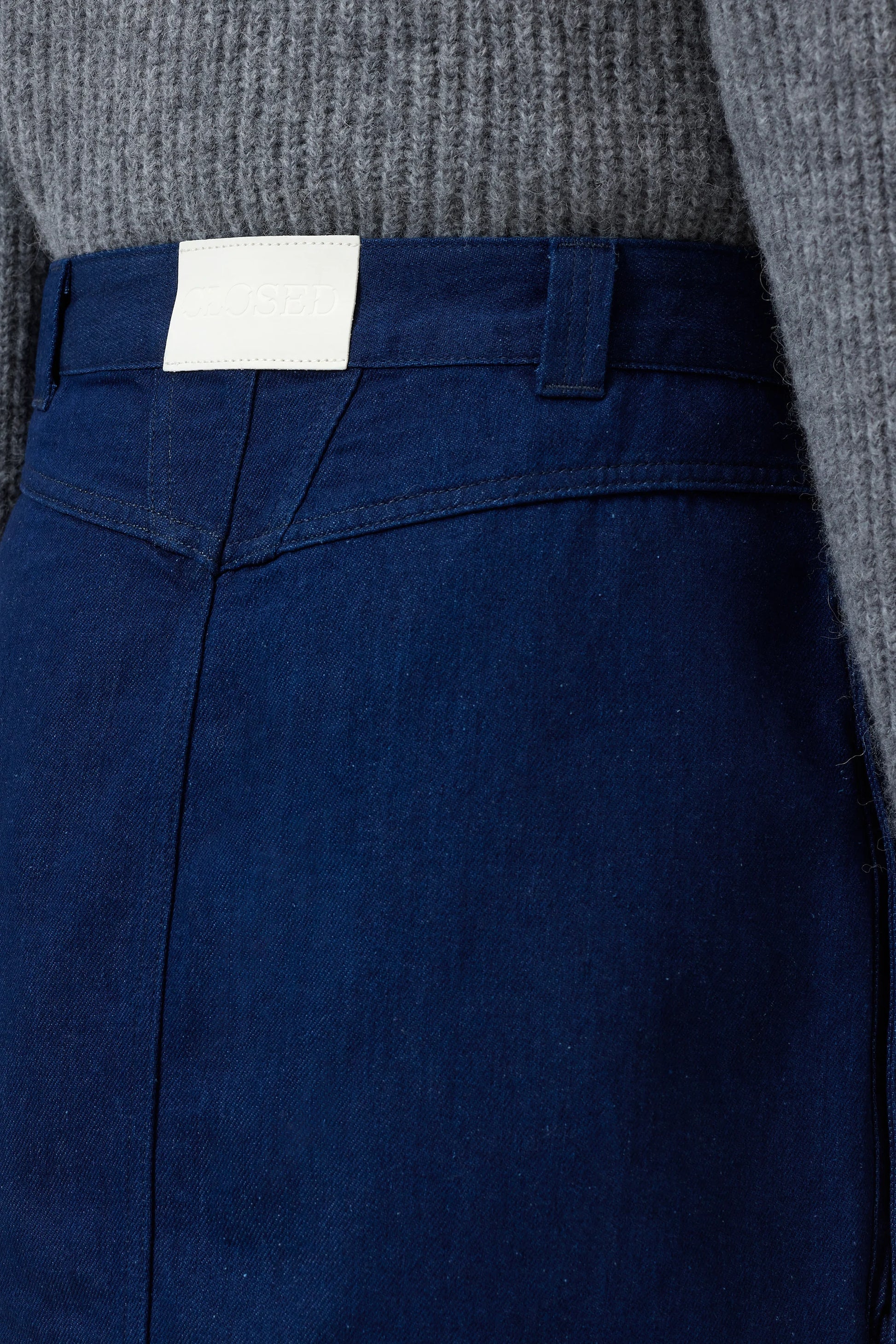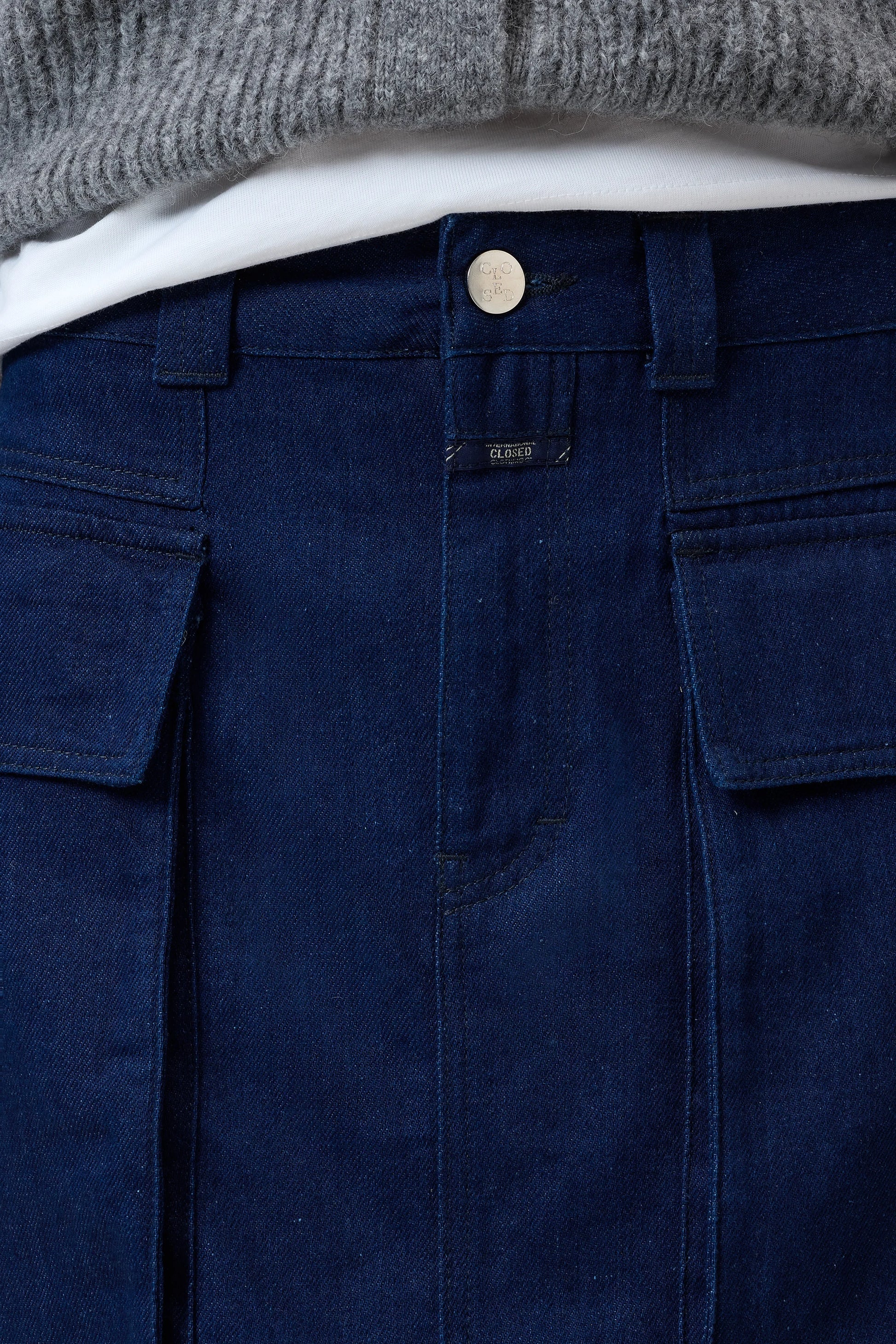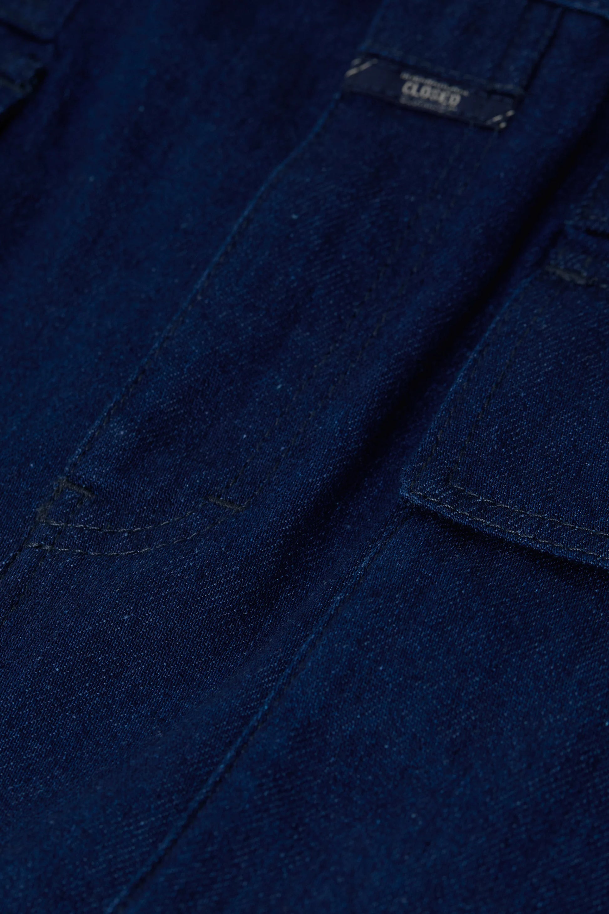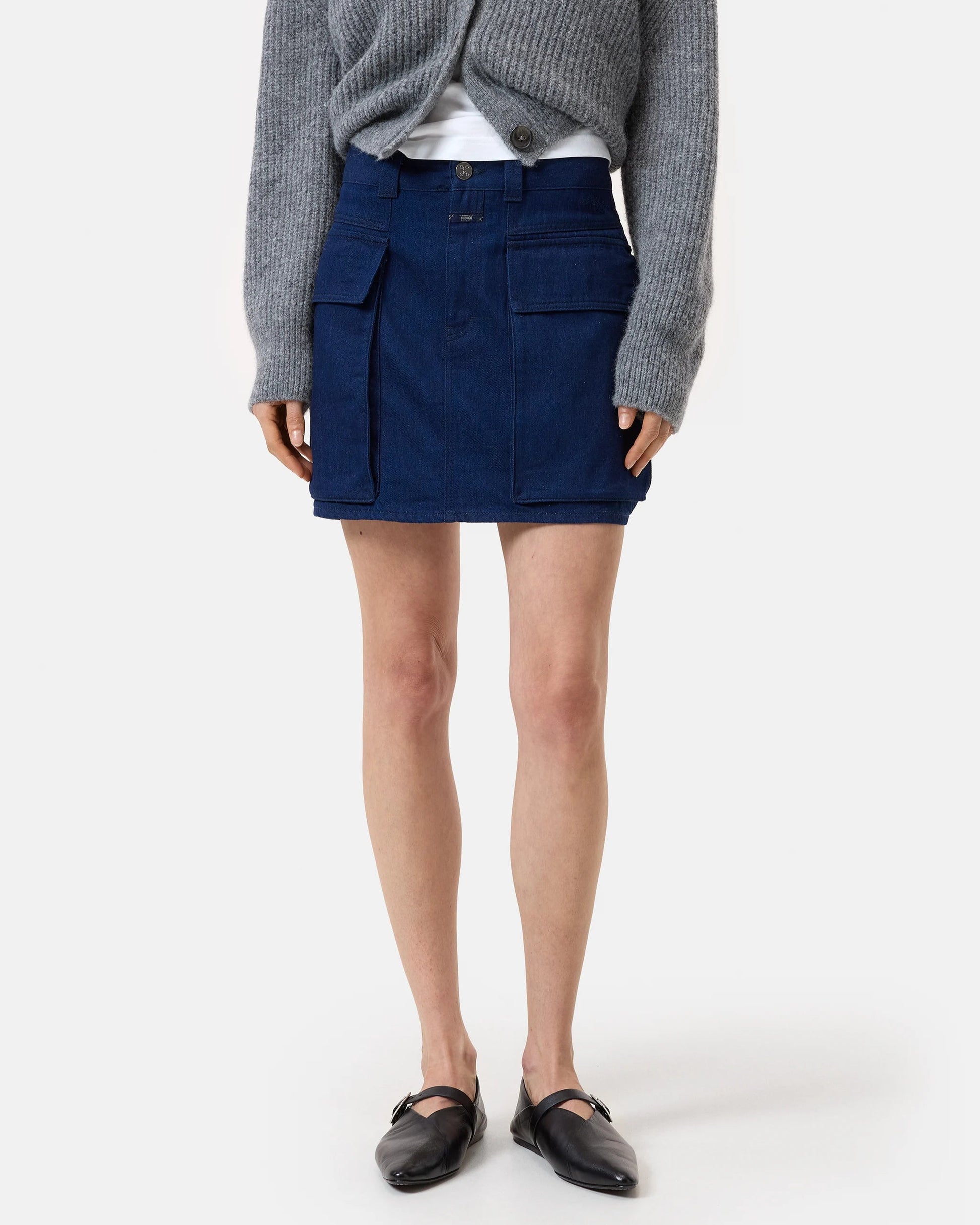 Realizzata in Italia in denim rigido blu indaco brillante (10 once): Minigonna con tasche cargo, bottone con logo, chiusura con zip e patch in pelle chiara sul retro.