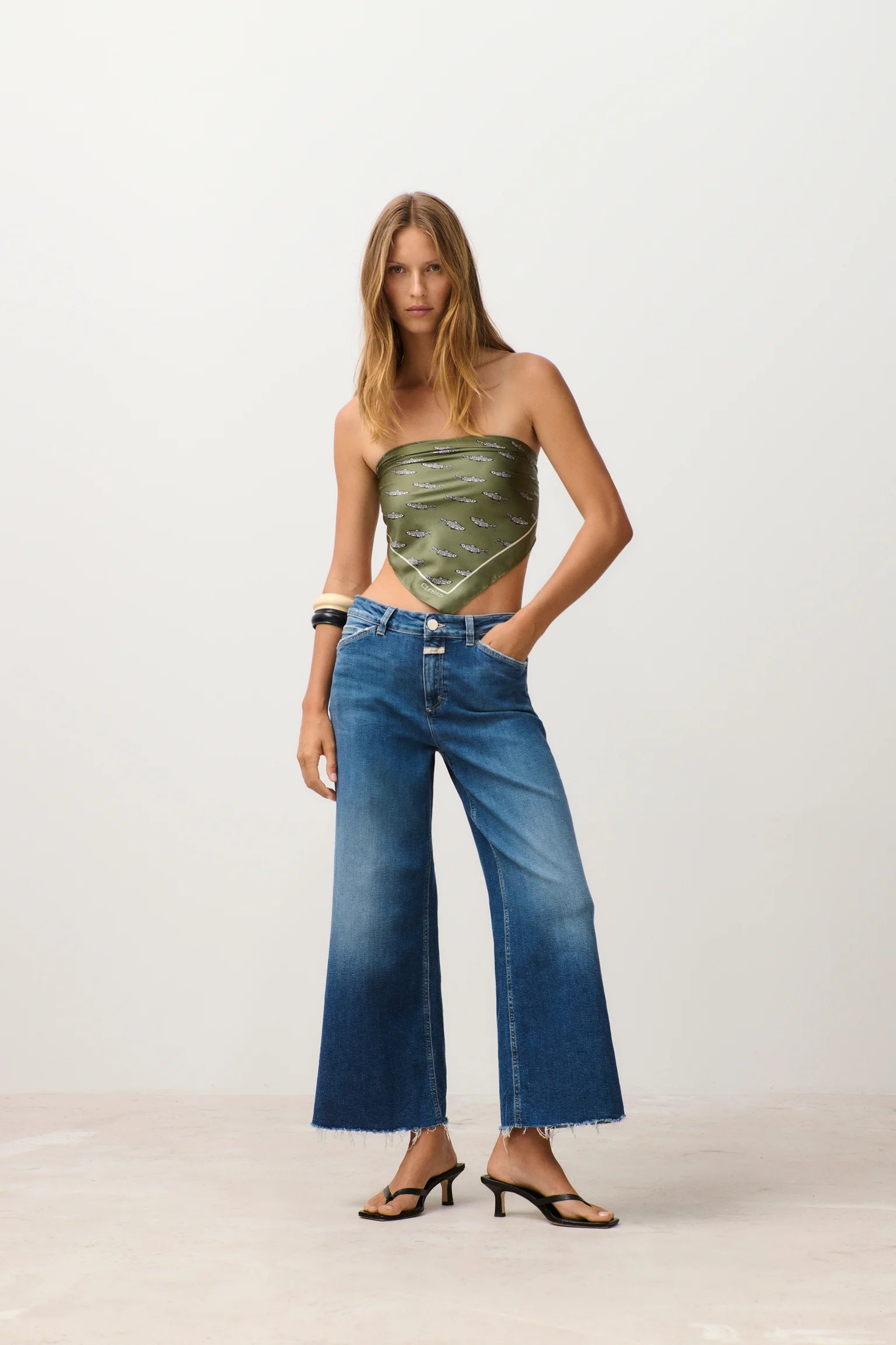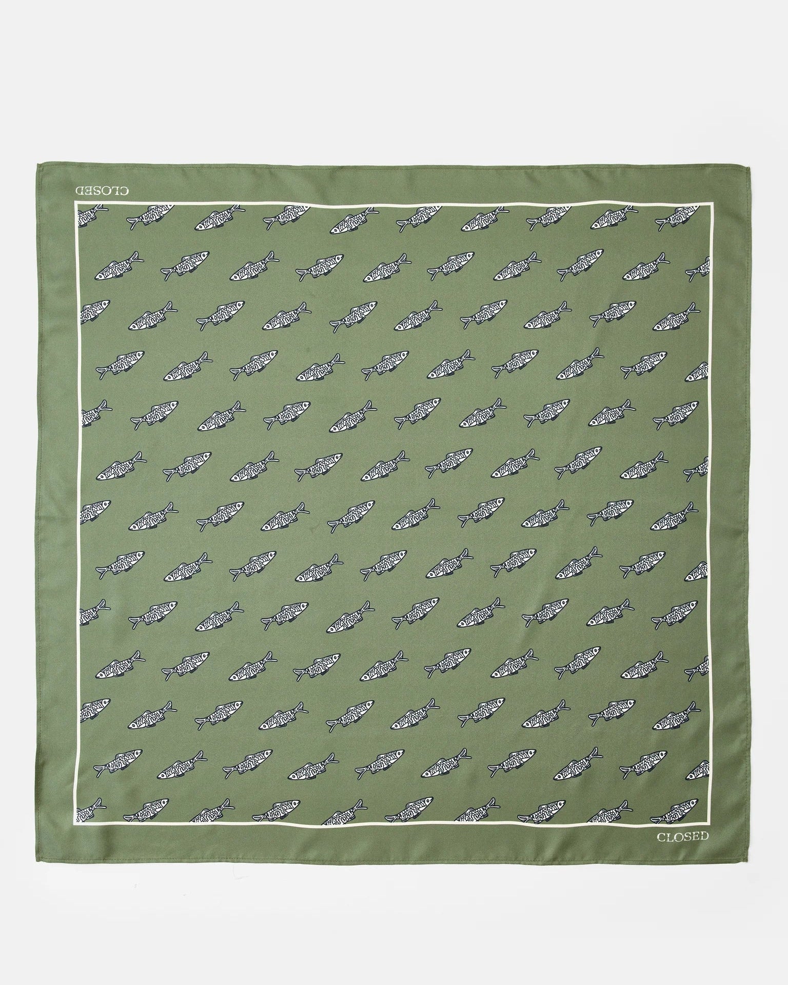Foulard quadrato in pura seta con stampa a forma di pesce, disegnato in esclusiva per Closed. Bordi orlati e logo Closed completano il design.