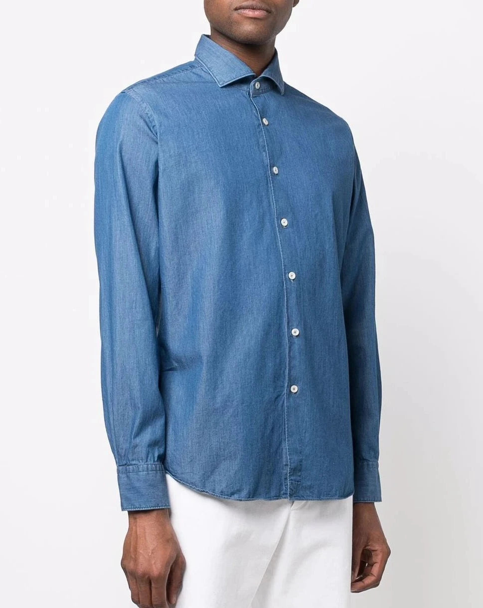 Camicia lavata in capo per un effetto sportivo e casual. Il collo francese aggiornato ed i polsini rotondi, risultano essere morbidi e descostruiti. Dopo ogni lavaggio e stiro, risulteranno vivi con un sapore naturalmente vissuto. La vestibillità tailor fit wash risulta essere aggiornata nei volumi, asciutta nelle taglie piccole e confortevole in quelle piu' alte. Cucita nella migliore tradizione sartoriale con 7 punti per centimetro, stecche estraibili, mosche sul fondo e gambo con filo di seta termosaldato per ogni bottone.
