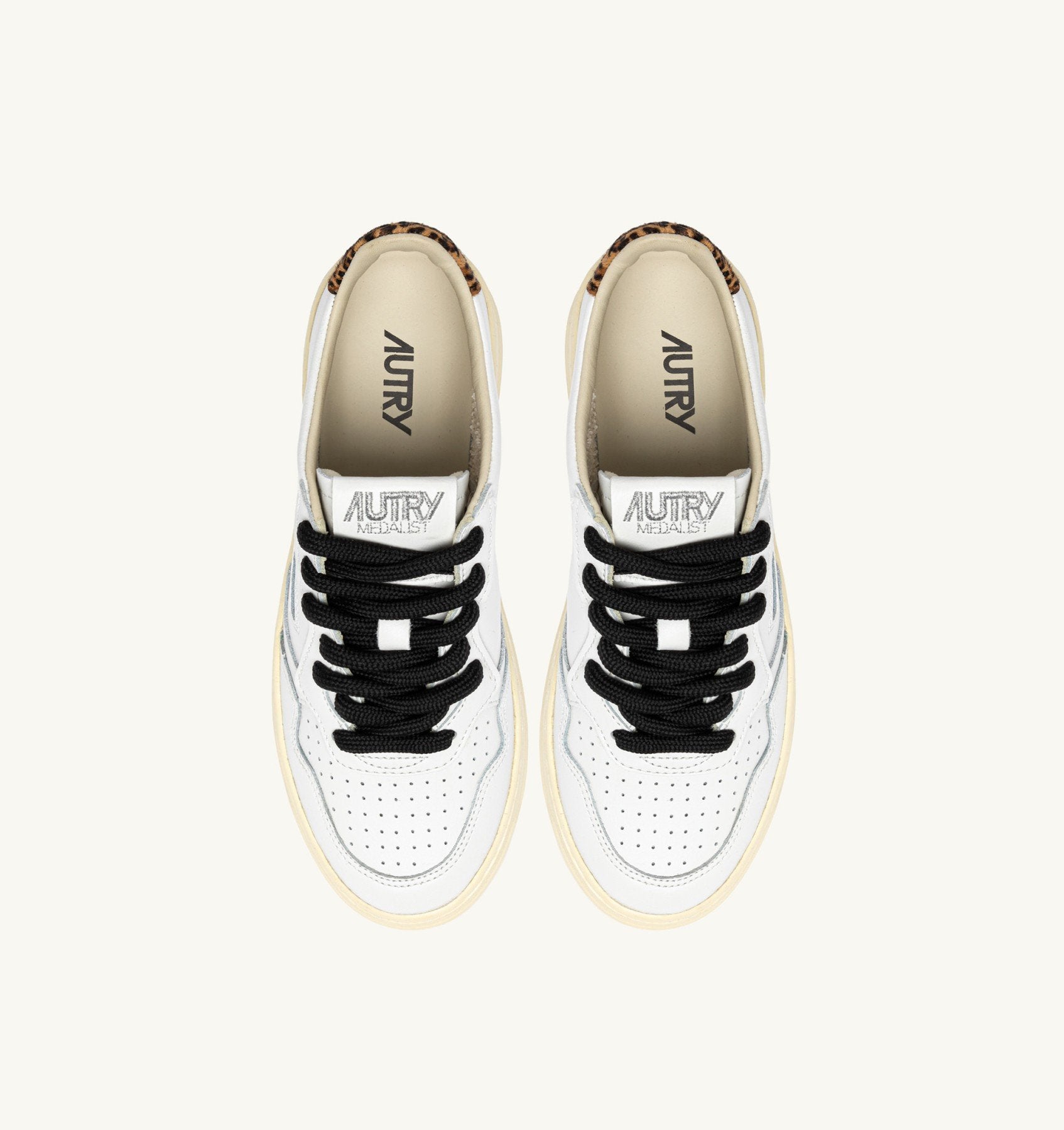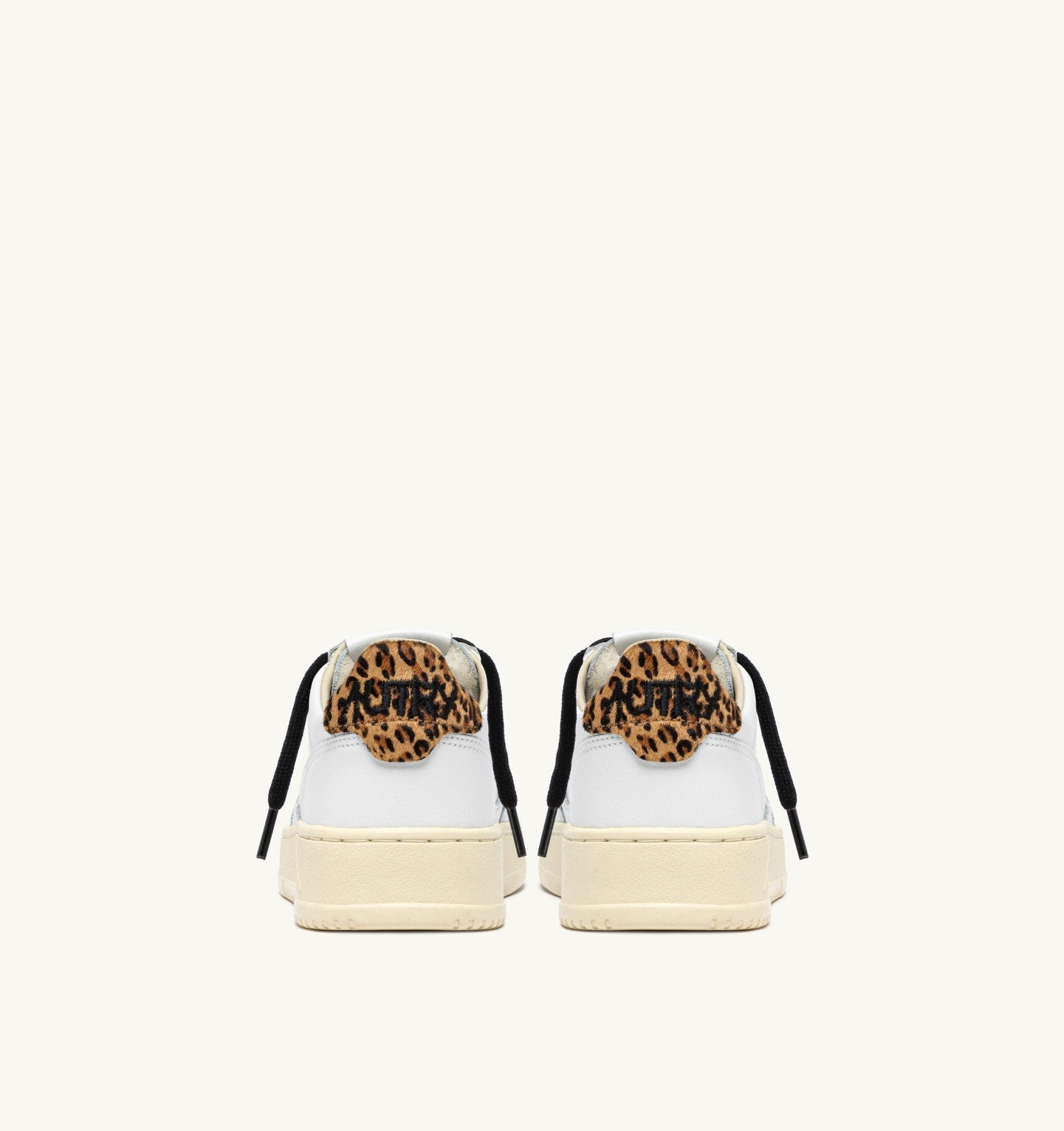 Questa sneaker da donna è realizzata in morbida pelle bianca dall'aspetto autentico ed è rifinita con originali dettagli come i lacci neri e il logo laterale con effetto lurex dalla raffinata nuance argento. Il dettaglio effetto cavallino stampa animalier che decora il tallone è personalizzato con il logo Autry ricamato.