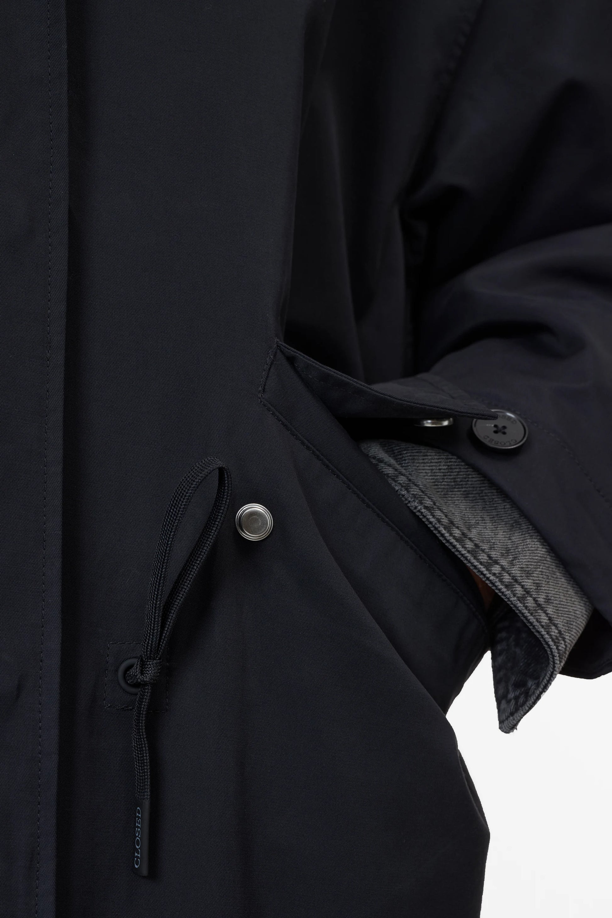 Questo parka lungo e dalla vestibilità regolare è ideale per le mezze stagioni: è realizzato in un misto cotone-nylon traspirante ma resistente con finitura idrorepellente e presenta un'imbottitura leggera Thermore Ecodown®. Presenta inoltre una chiusura con zip e bottoni nascosti, un cappuccio staccabile, tasche con patta e una cintura regolabile. L'orlo a coda di pesce e il discreto ricamo del logo sulla manica completano il design.
